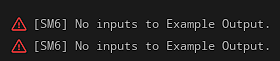 As you can see, we get the error for not having any inputs connected to the Example Output node.